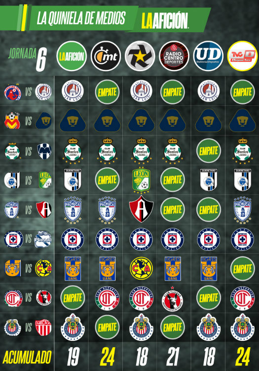 No obstante, aunque se están en el sótano general, Multimedios y el Universal Deportes pueden -en cualquier momento- alcanzar a los punteros, en caso de una buena jornada, con sus 18 aciertos hasta el momento.