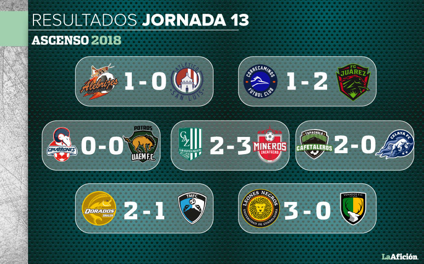 Terminó la jornada 13 en el Ascenso MX donde cinco equipos ya tienen su pase a la Liguilla por el título del Apertura 2018. Juárez, Mineros, Atlante, Cimarrones y San Luis.
