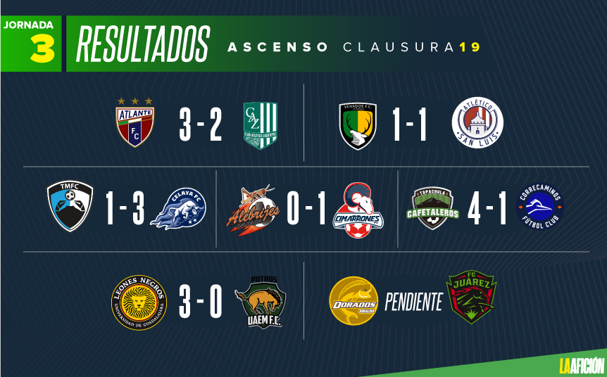 Por su parte, Cimarrones consiguió el triunfo en la Fecha 3 por la mínima ante Alebrijes de Oaxaca; mientras que el actual campeón de la liga de plata logró empatar 1-1 con Venados, quien ocupa el cuarto lugar.