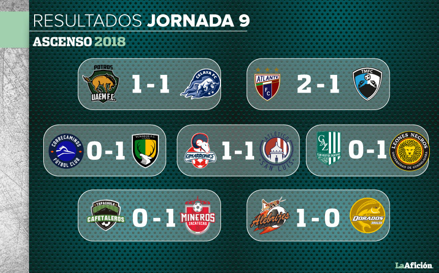 Resultados fecha nueve: Potros UAEM 1-1 Celaya, Atlante 2-1 Tampico Madero, Correcaminos UAT 0-1 Venados, Cimarrones 1-1 Atlético San Luis, Atlético Zacatepec 0-1 U de G, Cafetaleros 0-1 Mineros y Alebrijes 1-0 Dorados.