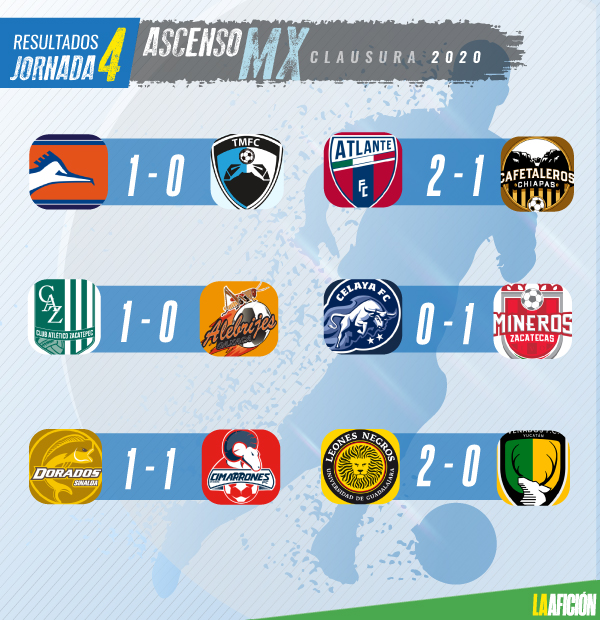 Llegó a su fin la cuarta Jornada del Clausura 2020 en el Ascenso MX, certamen que -al momento- dominan los Mineros de Zacatecas quienes se mantienen invictos y sin recibir gol, acumulando 14 puntos, condición que se mantuvo tras su victoria ante el Celaya.