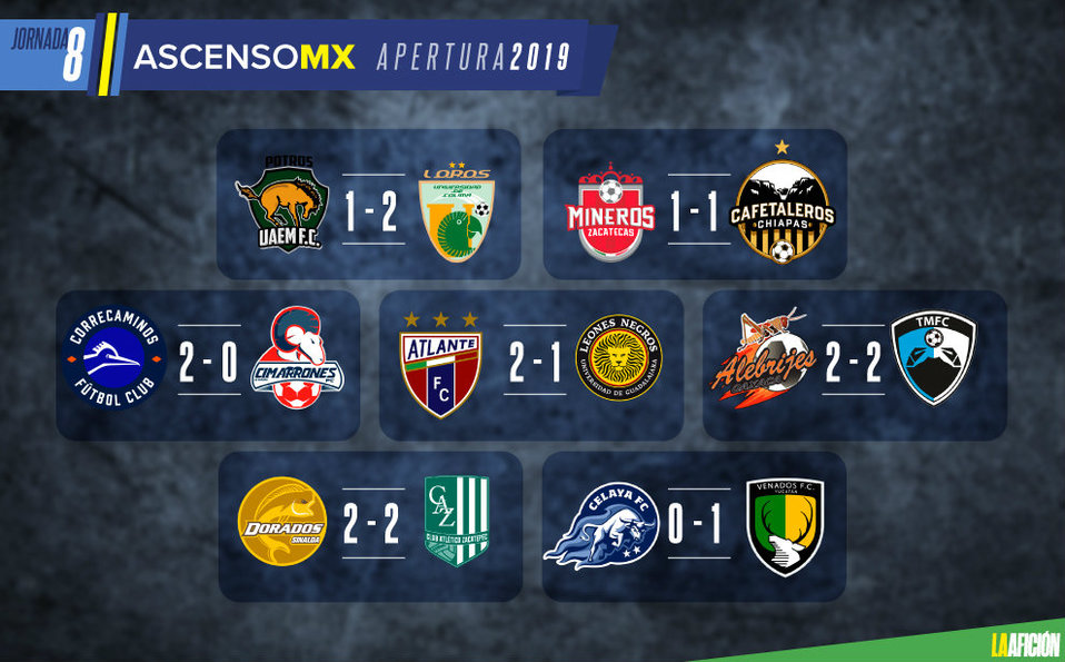 Esta octava jornada sirvió para que Correcaminos pudiera obtener su primera victoria, de 2-0 ante Cimarrones, y con ello, ya no es último lugar en la tabla y ese puesto corresponde a Potros UAEM, que cayó en casa por 2-1 ante Loros de Colima.