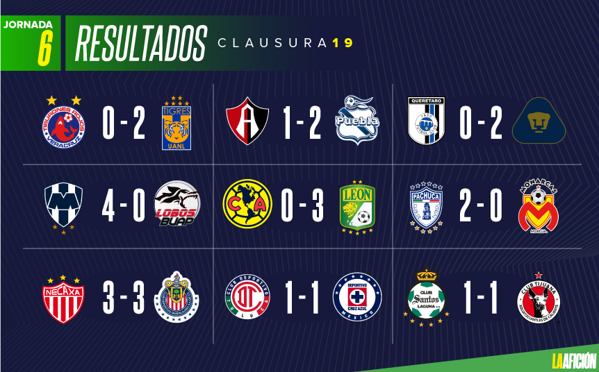 Terminó la jornada 6 del Clausura 2019 en la Liga MX y los resultados del fin de semana arrojan al Monterrey como líder de la tabla general seguido de los Tigres.
