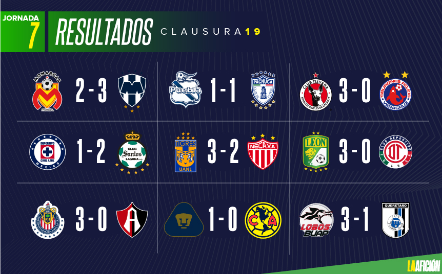 Rayados de Monterrey se mantiene como líder de la tabla general tras los resultados de la jornada 7 en el Clausura 2019 de la Liga MX.