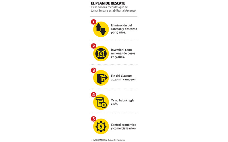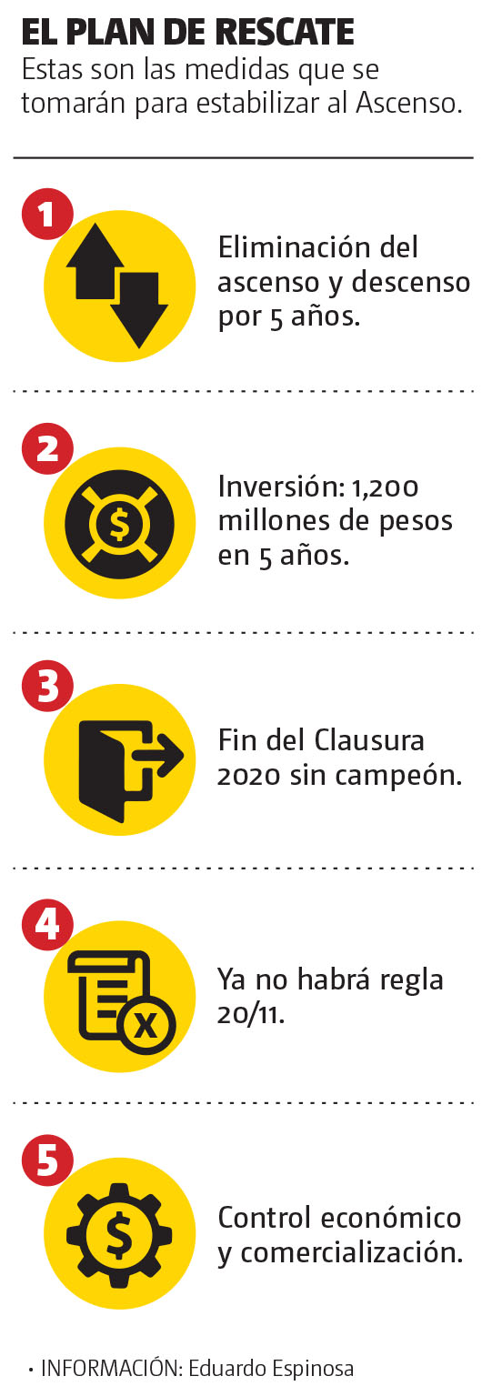 La situación en el Ascenso Mx era insostenible, razón por la que se tuvo que pedir apoyo a los equipos de la Liga Mx, los cuales destinarán de entrada 60 millones de pesos para que los 12 clubes de la división puedan pagar los gastos de esta temporada, la cual finaliza sin tener campeón, y después vendrá un rescate de mil 200 millones de pesos durante los próximos cinco años. Eso sí, en este mismo periodo no habrá ascenso ni descenso, con el fin de estabilizar al circuito.