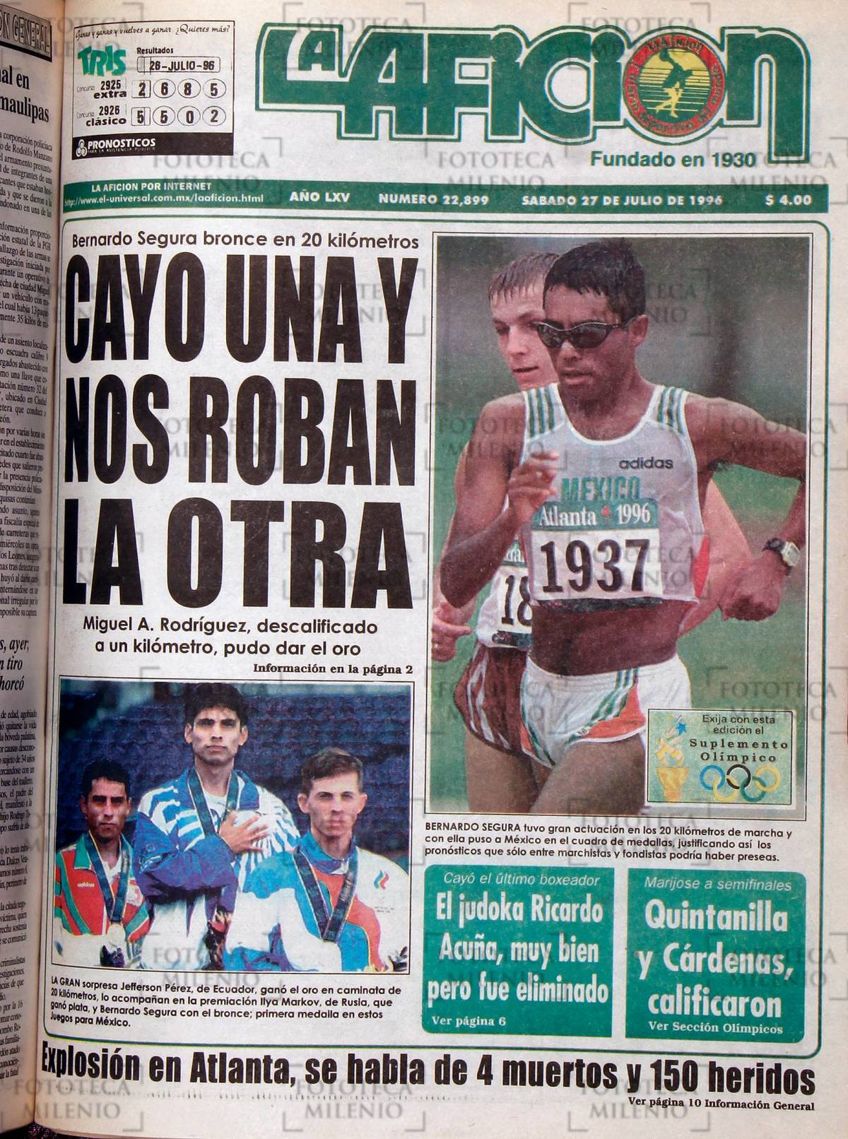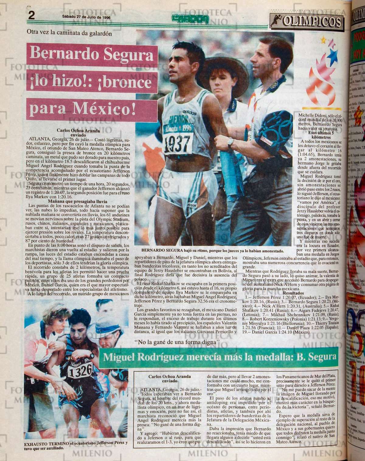 Costó lágrimas, sudor, esfuerzo, pero por fin cayó la medalla olímpica para México, el oriundo de San Mateo Atenco, Bernardo Segura, consiguió la presea de bronce en 20 kilómetros caminata, un metal que pudo ser dorado para nuestro país, pero en el kilómetro 18.5 descalificaron al chihuahuense Miguel Ángel Rodríguez cuando tomaba la punta de la competencia acompañado por el ecuatoriano Jefferson Pérez, quien finalmente hizo doblar las campanas de todo Quito, al llevarse el primer lugar.