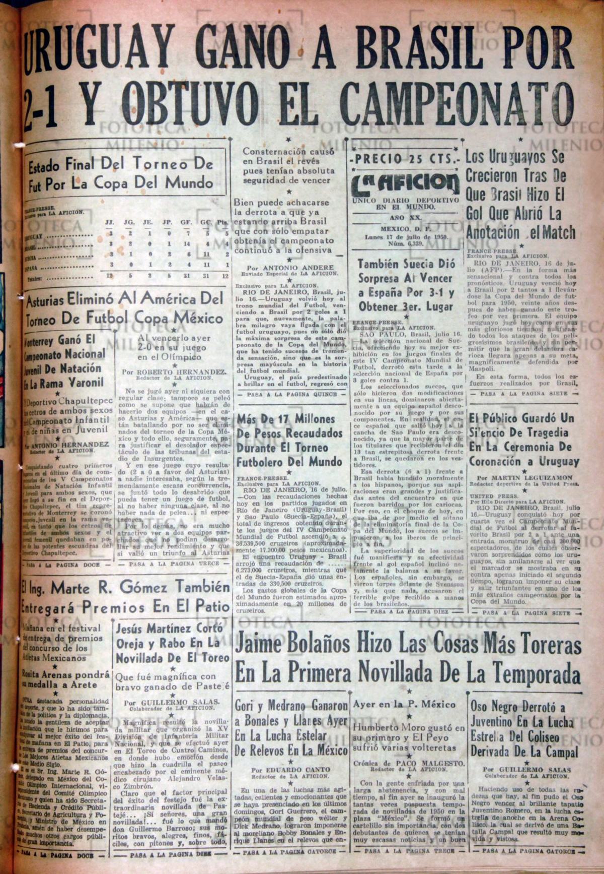 El Mundial de 1950 fue el primero que se realizó después de la Segunda Guerra Mundial y La Afición estuvo presente reportando todos los pormenores. Solo participaron 13 países –seis europeos y siete americanos– divididos en cuatro grupos, los líderes de cada sector avanzaron a una fase final en la que jugaron todos contra todos.
