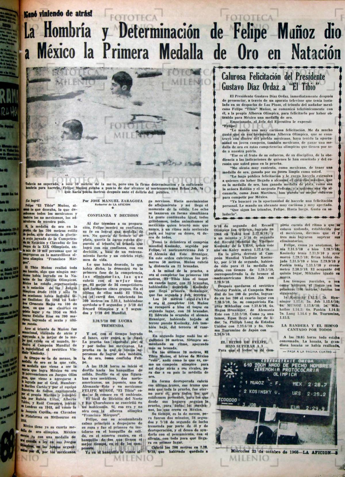 Felipe Muñoz y María Teresa Ramírez escribieron historia pura en la natación mexicana. El Tibio consiguió la medalla de oro en los 200 metros de pecho, mientras que Ramírez Gómez se llevó la presea de bronce en los 800 metros libres. Su triunfo es más significativo, tomando en cuenta que, a la fecha, ningún otro nadador mexicano ha podido subir al podio.