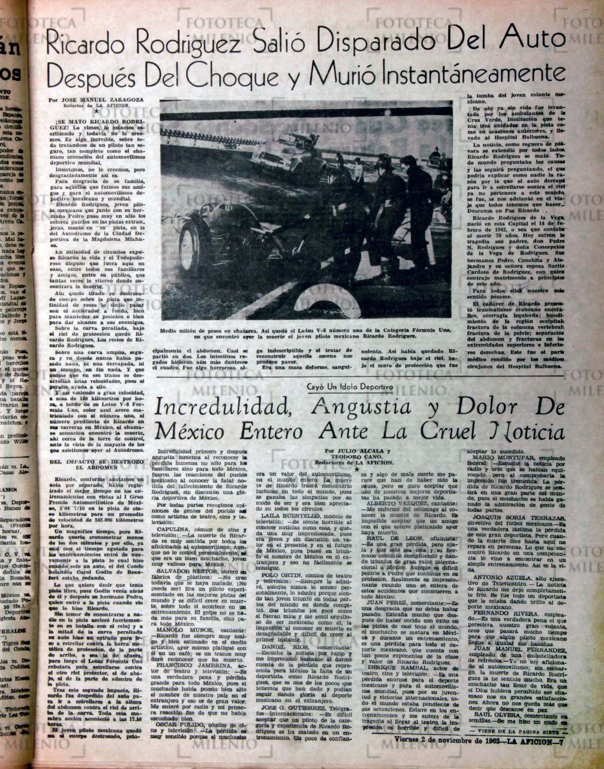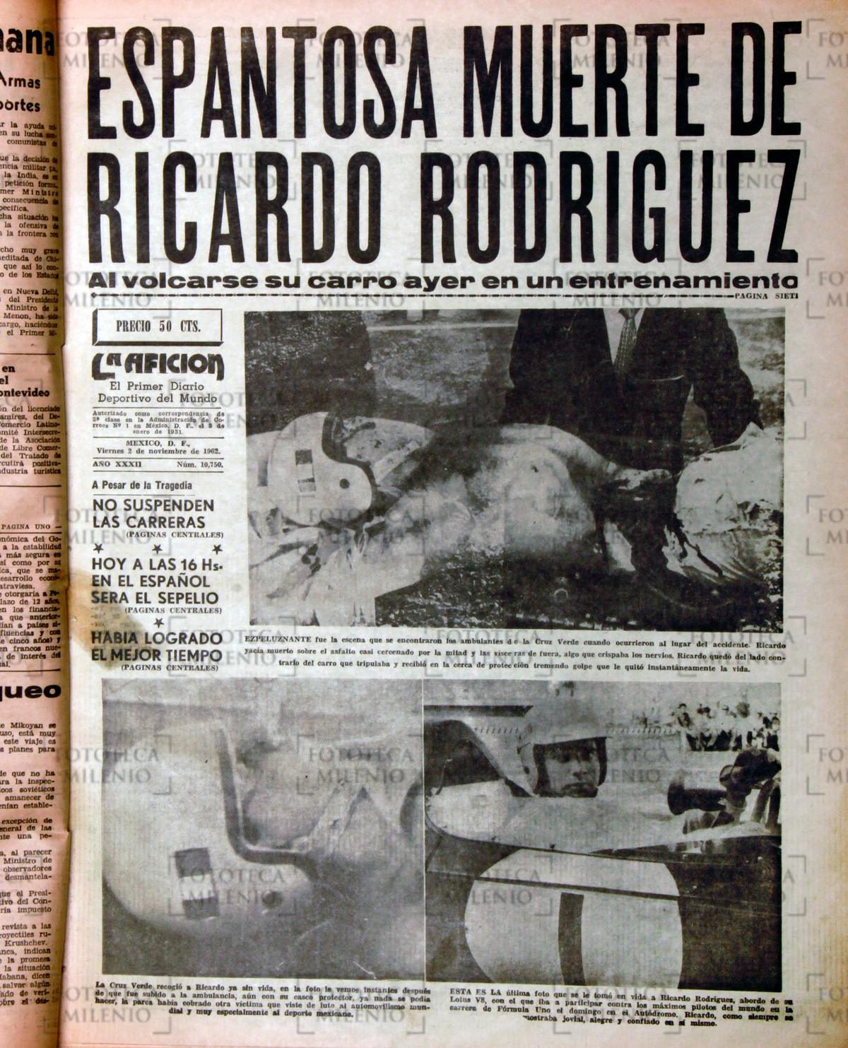 Insistimos, no lo creemos, pero desgraciadamente así es. Para desgracia de su familia, para aquellos que fuimos sus amigos y para el automovilismo deportivo mexicano y mundial. Ricardo Rodríguez, joven piloto mexicano que junto con su hermano Pedro puso muy en alto los colores patrios en las pistas extranjeras, murió en “su” pista, en el Autódromo de la Ciudad Deportiva de la Magdalena Mixhuca.