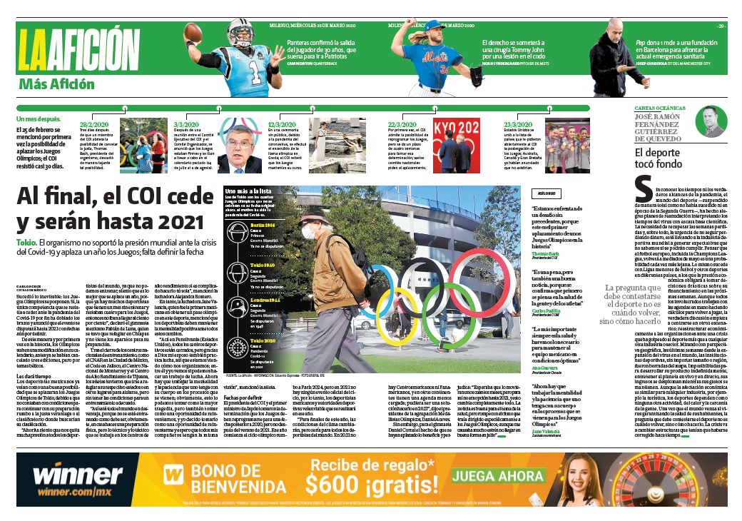 Portada tras la decisión del COI sobre retrasar los Juegos Olímpicos (Archivo)