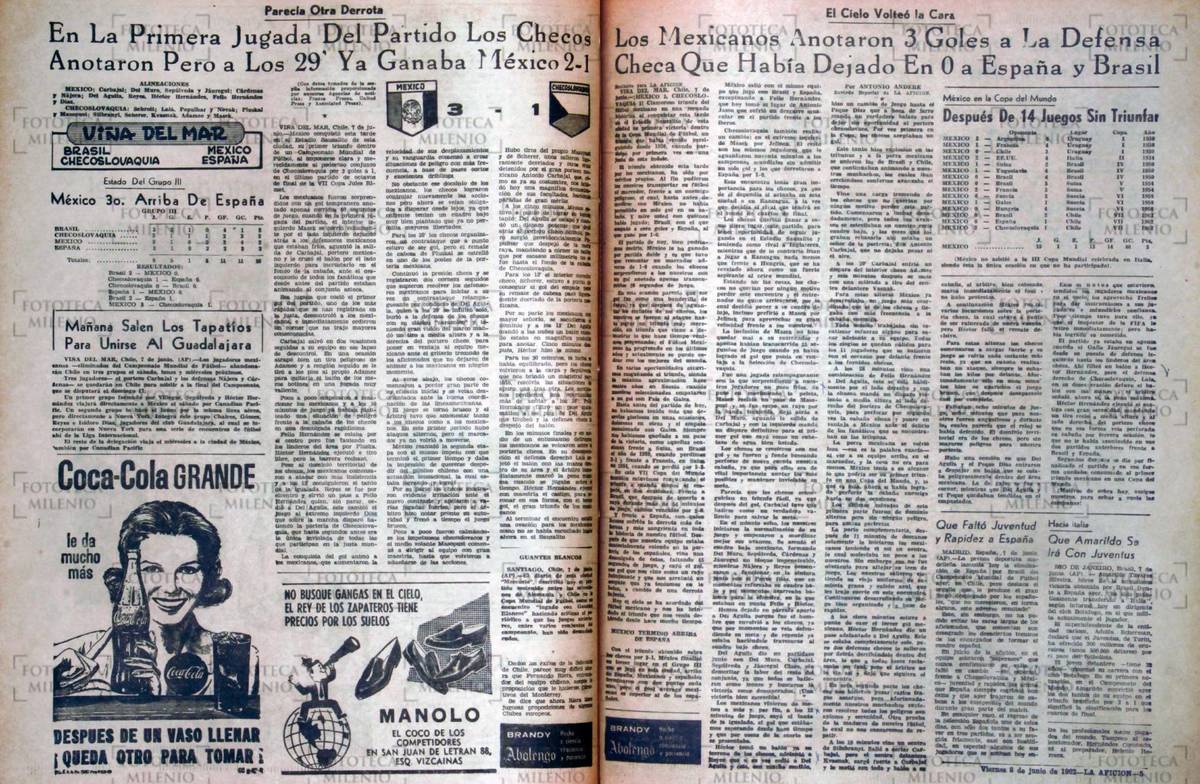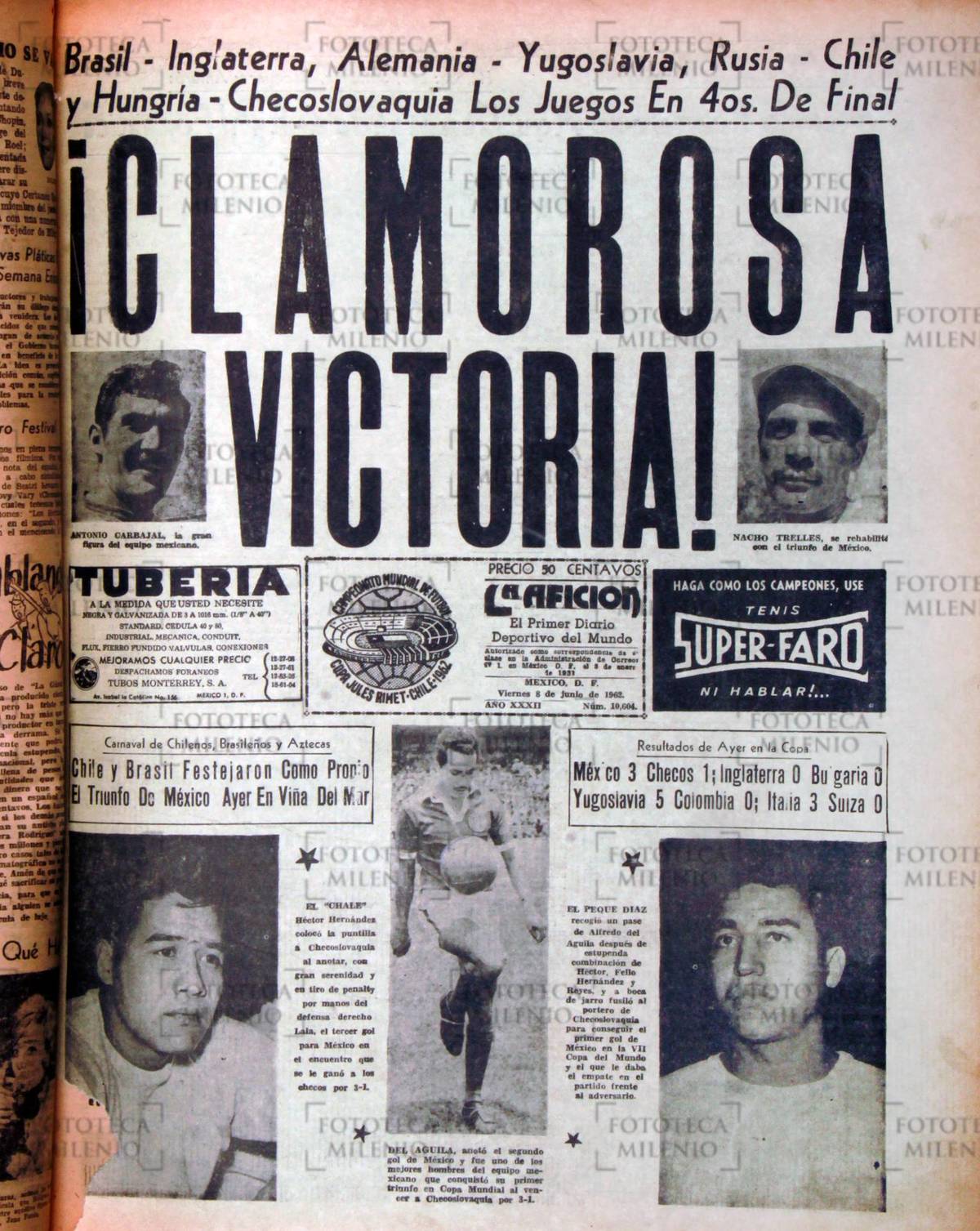 Después de cinco participaciones mundialistas, la selección mexicana consiguió su primera victoria en la justa internacional. Con el mítico Ignacio Trelles en el banquillo, el Tri se sobrepuso a una desventaja temprana y derrotó 3-1 a Checoslovaquia, para despedirse de la mejor manera del Mundial de Chile en 1962.