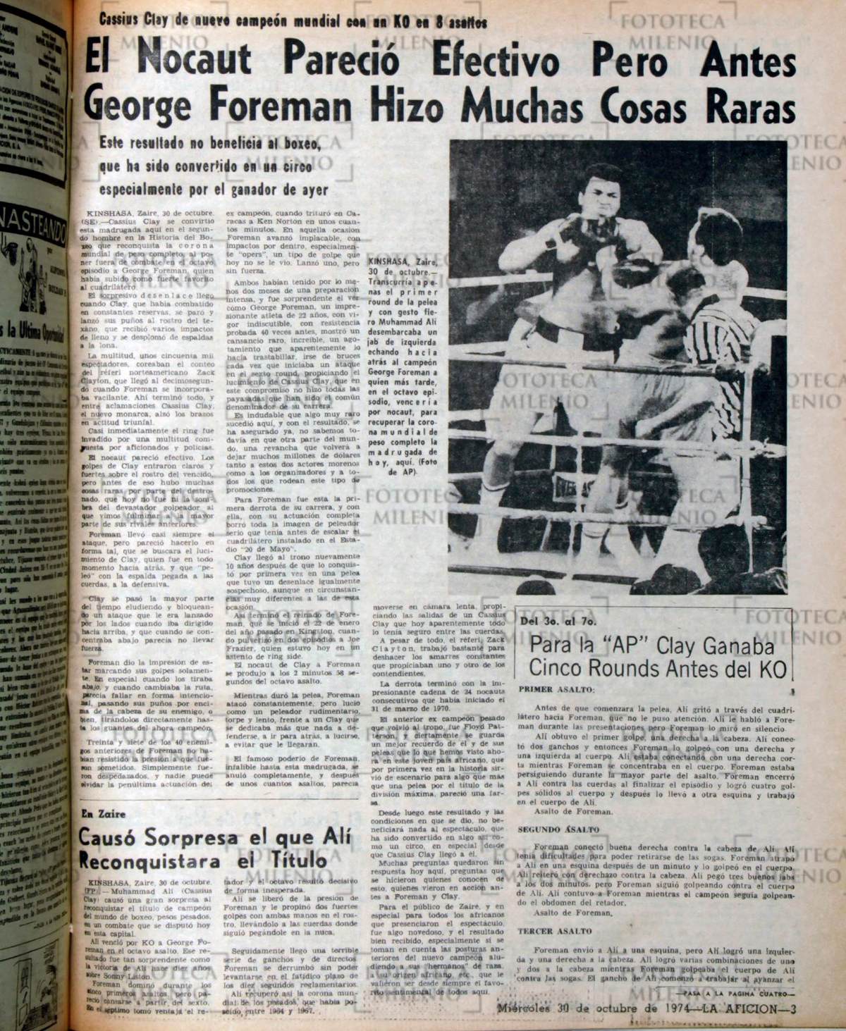 Cassius Clay se convirtió esta madrugada aquí en el segundo hombre en la historia del boxeo que reconquista la corona mundial de peso completo, al poner fuera de combate en el octavo episodio a George Foreman, quien había subido como fuerte favorito el cuadrilátero.