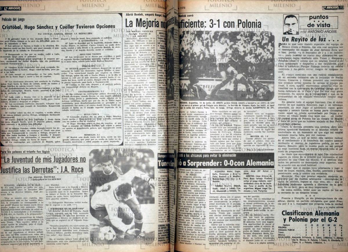 No obstante que la Selección Mexicana demostró hoy algo que se acercó a su real nivel de juego, no pudo contener la potencialidad de su similar de Polonia y cayó vencida 3-1. Los polacos se adjudicaron la primera ubicación en el Grupo Dos de la rueda por los cuartos de final, superando a Alemania. México concluyó en el último puesto de este mismo grupo sin contabilizar un solo punto.