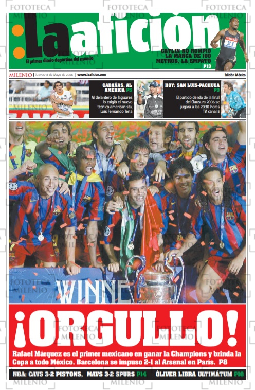 “Este triunfo se lo dedico a mi país, donde seguramente me vieron en directo, va para México”, Rafael Márquez, defensa del Barcelona.
