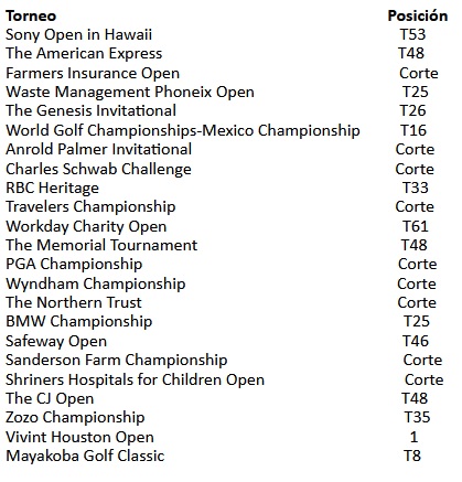 Noviembre estará marcado siempre en los recuerdos del tapatío. La temporada anterior se había quedado en el cuarto puesto, pero al fin pudo conquistar su primer título en el PGA Tour cuando llegó al Vivint Houston Open. Terminó por encima de Dustin Johnson, número uno del mundo, en un triunfo que también fue histórico para todo el mundo.