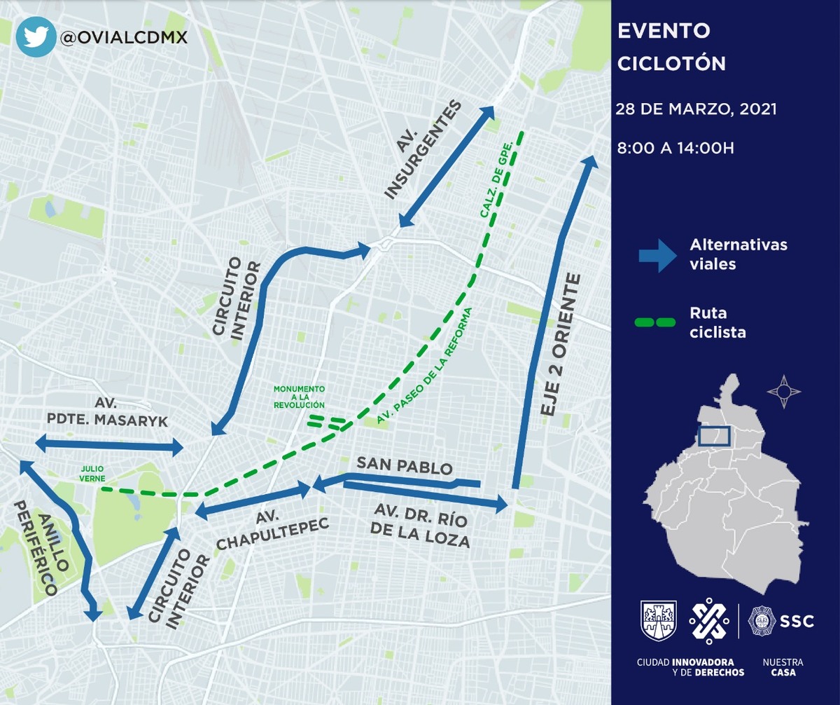 Derivado de los cortes a la circulación que se realizan por la ruta ciclista, la SSC recomienda utilizar las siguientes alternativas viales: Anillo Periférico, Circuito Interior, avenida Presidente Masaryk, avenida Chapultepec, San Pablo, Doctor Río de la Loza, Eje 2 Oriente y avenida De los Insurgentes.