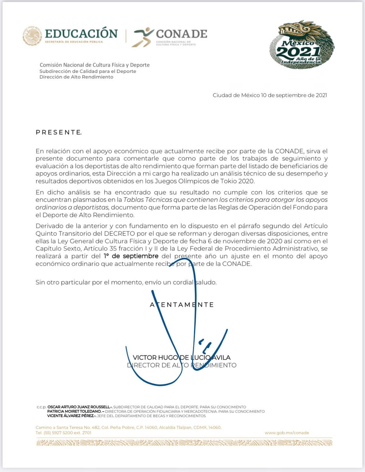 El 1 de septiembre la Conade comenzó a mandar una carta firmada por el director de alto rendimiento, Víctor Hugo de Lucio Ávila, a los deportistas que no lograron un buen resultado en la justa olímpica, y que en algunos casos fueron clave para tirarle el pronóstico de 10 medallas al organismo que dirige Ana Guevara. Aunque en el documento se informaba una reducción en el monto de la beca por no cumplir con los parámetros requeridos, varios atletas se llevaron la sorpresa que ese recorte fue muy extremo.