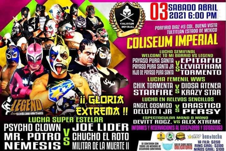 El Totalmente Payaso hará equipo en la lucha súper estelar junto a MR. Potro y Nemesis en una contienda de tercias frente Joe Líder, Chucho el Roto y Militar de la Muerte II, en un evento abierto al público con todas las medidas sanitarias ante la pandemia de covid-19.