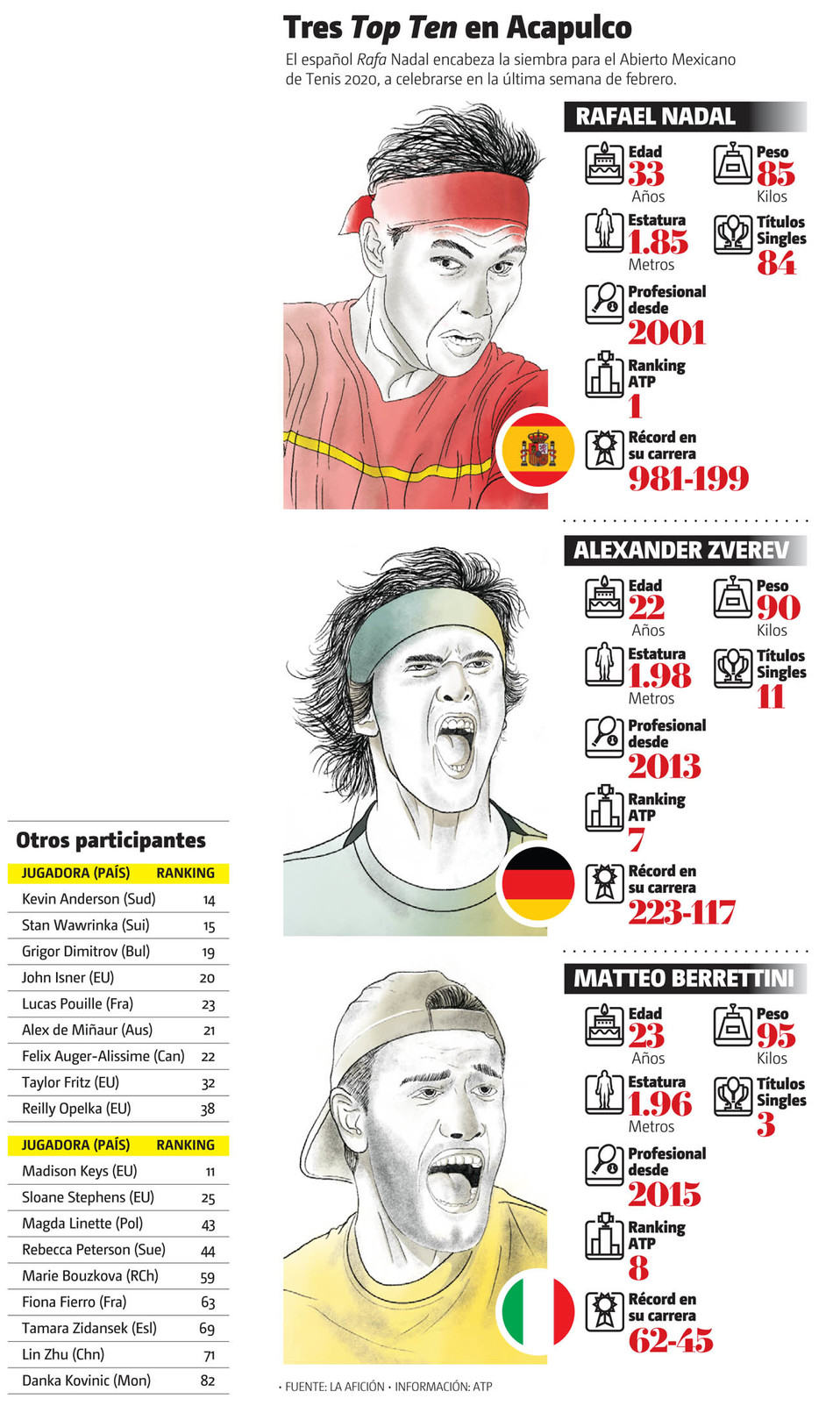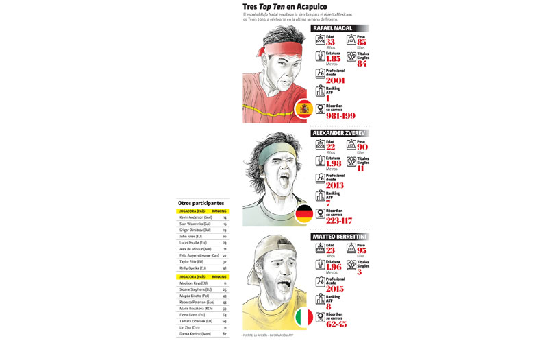 El Abierto Mexicano de Tenis a celebrarse del 24 al 29 de febrero en Acapulco anunció su lista de jugadores para su edición 27. El No. 1 del ranking de la ATP, Rafael Nadal, ya había sido anunciado hace unos meses, pero al español se suman Alexander Zverev, con su tercera participación consecutiva y tras visitar en noviembre el país junto a Federer; también Mario Berrettini No. 8 del mundo, Kevin Anderson, Stan Wawrinka, John Isner, Feliciano López, Grigor Dimitrov, campeón en 2014 en Acapulco, además por supuesto del campeón defensor, el polémico Nick Kyrgios. Su compatriota australiano Alex De Miñaur llega por primera vez al igual que Lucas Pouille, quien ya ha estado en Los Cabos.