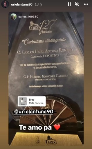Uriel, quien inició su carrera profesional en las Fuerzas Básicas de Santos Laguna, donde saltó al futbol de Europa y actualmente forma parte del equipo Guadalajara de la Liga MX, no pudo estar presente, así que fue su madre, Bertha Alicia Romero Torres, quien acudió en su representación para recibir tal distinción.