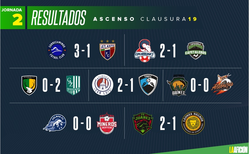 Se celebraron dos fechas en el Ascenso MX del futbol mexicano, donde los resultados dejaron a Correcaminos como el nuevo líder de la tabla general, posición que comparte junto a otros 5 equipos con cuatro unidades cada uno.