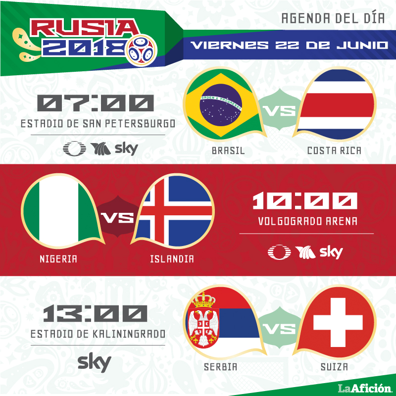 La actividad de este viernes 22 de junio se abre en San Petersburgo con un buen choque del grupo E, el cual estará protagonizado por Brasil y Costa Rica.