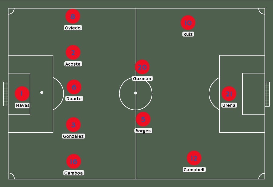 Navas; Gamboa, González, Duarte, Acosta, Oviedo; Borges, Ruíaz, Guzmán, Campbell; Ureña. DT. Óscar Ramírez.