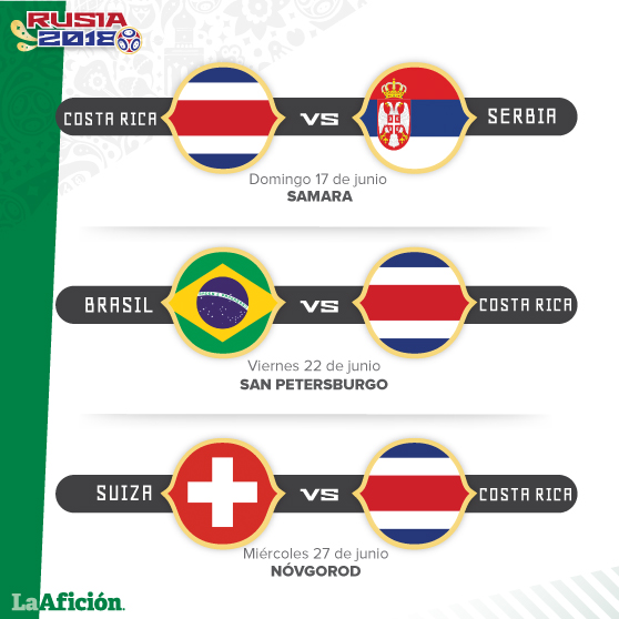 Costa Rica debutará en Rusia el 17 de junio, cuando en Samara choquen contra Serbia. El 22, en San Petersburgo, irán contra Brasil, para posteriormente cerrar, el 27, ante Suiza en Nóvgorod.