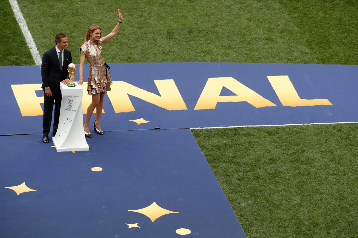 09:51 HORAS: Aparecen el alemán Philip Lahm y la modelo rusa Natalia Vodianova con la Copa del Mundo.