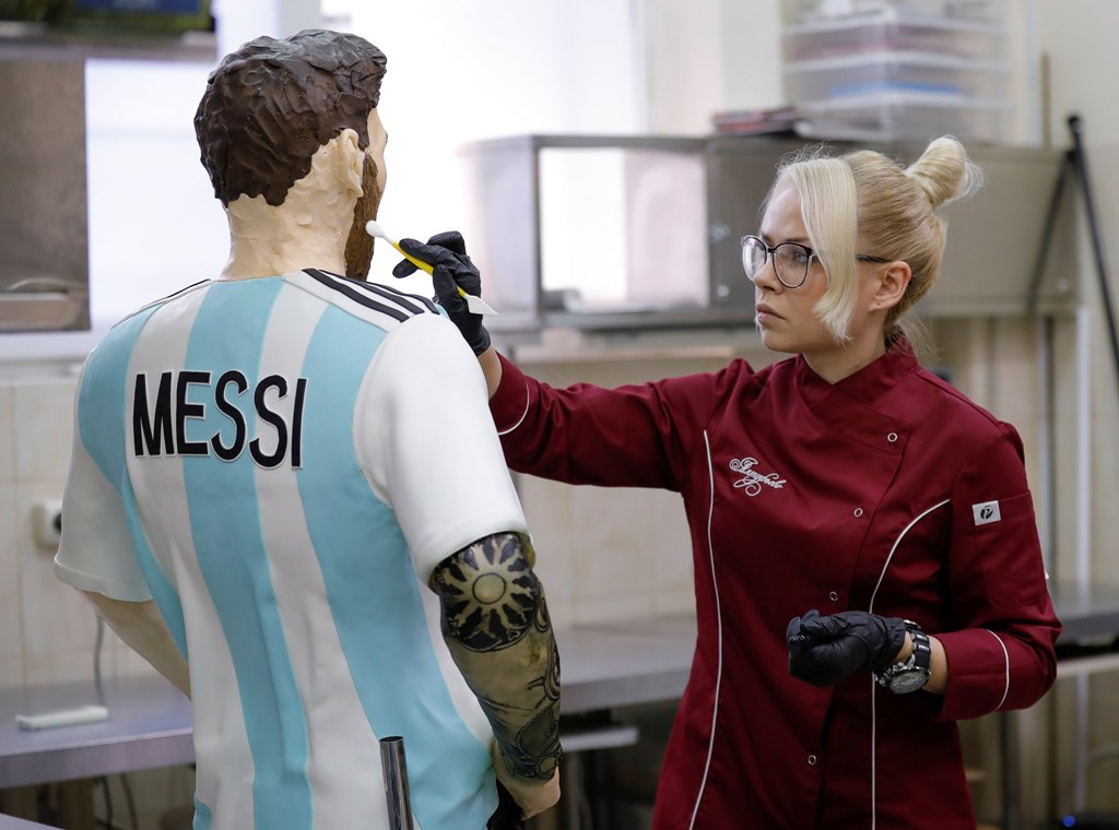 "Descubrimos por casualidad que era el cumpleaños de Messi el 24 de junio", dijo la confitera Daria Malkina. "Y pensamos, '¿por qué no hacerle un regalo a Leo, una escultura de chocolate de él mismo?'".