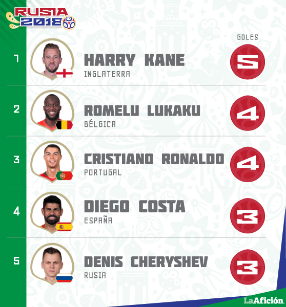 El top cinco es completado por Diego Costa y Dénis Cheryshev, con tres goles cada uno. Ni el español ni el ruso pudieron aparecer en el marcador en sus respectivos partidos, si bien sus selecciones ya están clasificadas a los Octavos de Final, donde precisamente se enfrentarán.
