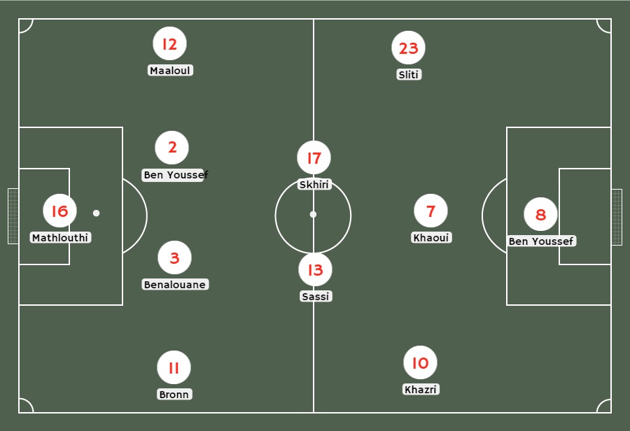 Mathlouthi; Khaziri, Benalouane, Ben Youssef, Maaloul; Khaoui, Skhiri, Sliti; Ben Youssef, Sassi. DT. Nabil Maaloul.