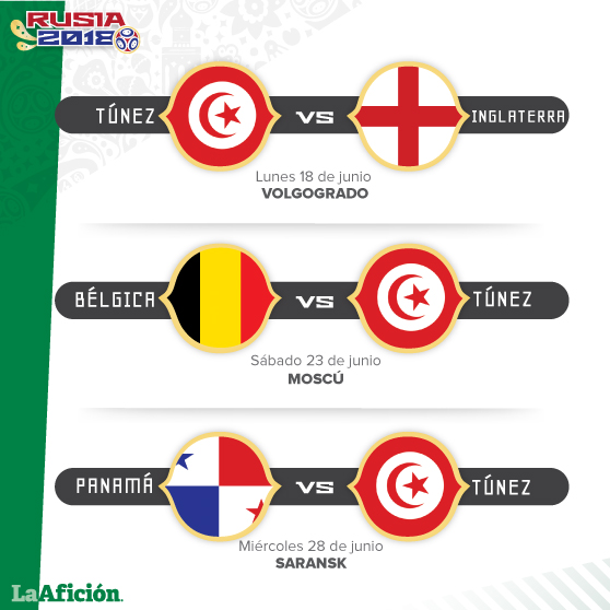 Túnez tendrá su debut en Rusia ante Inglaterra, duelo que se llevará el 18 de junio en Volgogrado. Posteriormente, el sábado 23, irá a Moscú para medirse a Bélgica; cinco días después, el 28, estarán en Saransk, para medirse a Panamá.