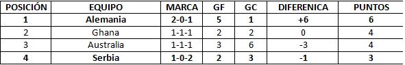 En la última jornada del grupo, la Mannschaft venció 0-1 a Ghana, mientras que Serbia cayó 2-1 ante Australia.