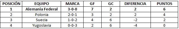 Por su parte, la República Federal alemana ganó su sector de la segunda fase, derrotando a Polonia, Yugoslavia y Suecia, lo que le dio el pase a la Final, en donde se impusieron a la legendaria Holanda de aquel Mundial, por 2-1.