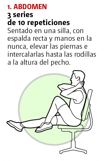 Con las manos en la nunca y sentado en una silla, deberás mantener la espalda recta para comenzar a elevar las piernas e intercalarlas hasta las rodillas a la altura del pecho, así tres veces con 10 repeticiones cada una.