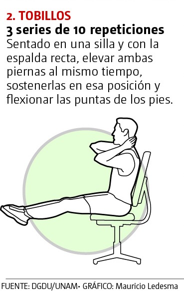 Te sentarás en una silla y con la espalda completamente recta elevaras ambas pierna al mismo tiempo, las cuales sostendrás en esa posición, para después comenzar a flexionar las puntas de los pies en tres series y cada una con 10 repeticiones.