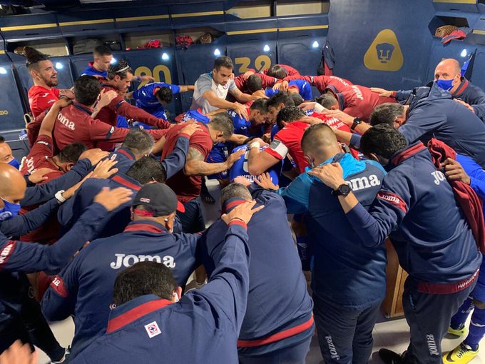El protocolo señala a los vestidores como un espacio de riesgo, por lo que recomienda la separación de un casillero entre jugadores y dos metros entre ellos; Cruz Azul rezó antes del juego contra Santos en ese espacio.