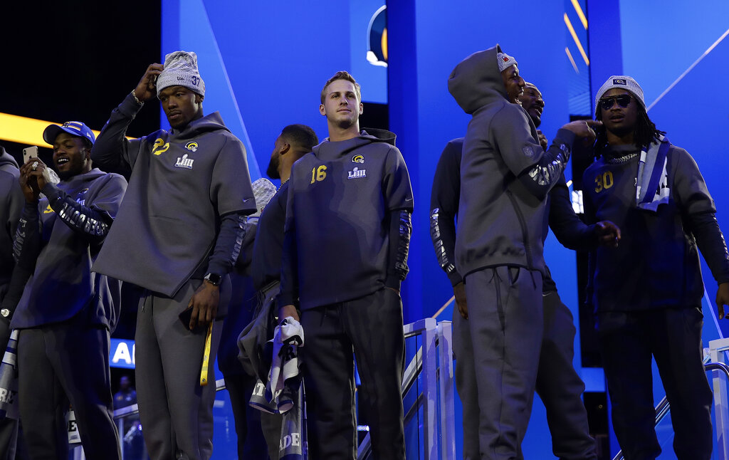 A las 7 de la noche empezaron a aparecer los jugadores de los Carneros. Bajaron por la rampa que los llevaría al escenario como si se tratara de una banda de rock. El primero en bajar fue Jared. Fueron presentados los principales jugadores, llegó todo el equipo y empezó el momento de bajar a responder preguntas. El podium número 6 estaba reservado para Goff. Ahí estaban 20 cámaras de televisión y al menos 30 reporteros esperando. Personal de la NFL se acercó a Jared y lo llevó a su lugar. Se sentó y esperó que dieran el aviso de que iniciaba el evento.