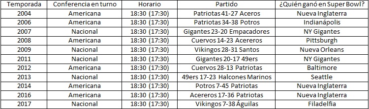 En cuanto a la rotación de estos duelos, la AFC juega en este horario (18:30) en año par; mientas que en año non, el turno es para la NFC.