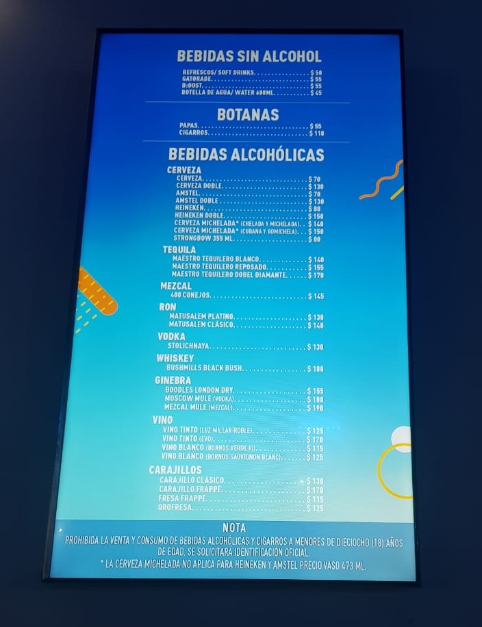 Ahora pasemos al costo de las bebidas las cuales varían, pues oscilan de los 45 hasta los 190 pesos; si lo único que quieres es refrescarte, una botella de agua te sale en 45 pesos, una bebida isotónica está en 55 pesos, los refrescos en 50 pesos; pero si lo que quieres es una cerveza, hay una gran variedad, por lo que podrás encontrarlas desde los 70 hasta los 150 pesos.