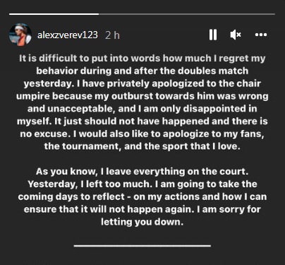 "Es difícil expresar con palabras lo mucho que lamento mi comportamiento durante y después del (partido de) dobles de ayer", escribió Zverev en Instagram en referencia al partido en el que cayó junto con el brasileño Marcelo Melo contra el británico Lloyd Glasspool y el finlandés Harri Leiovaara por 2-6, 6-4 y 6-10.
