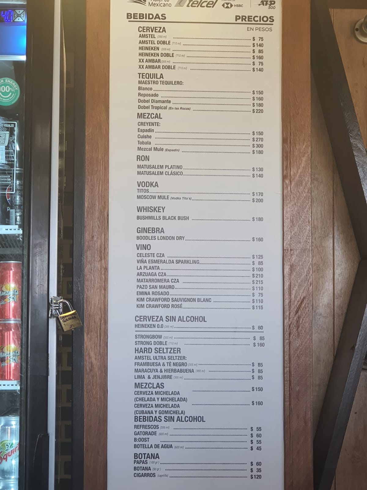 Respecto a las bebidas hay para todos los gustos: cervezas (de 75 a 160 pesos), tequila (desde 150 hasta 220 pesos), mezcal (desde 150 hasta 300 pesos), whisky (180 pesos), vodka (en 170 y 200 pesos), para los amantes del vino también hay diferentes tipos y van desde los 75 hasta los 275 pesos.