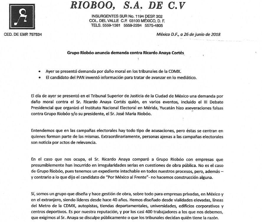 Grupo Riobóo interpuso una demanda por daño moral ante el Tribunal Superior de Justicia de la Ciudad de México contra Ricardo Anaya, debido a que el candidato de la coalición Por México al Frente acusó durante el tercer debate presidencial que José María Riobóo era el contratista favorito de Andrés Manuel López Obrador, cuando éste fue jefe de Gobierno.
