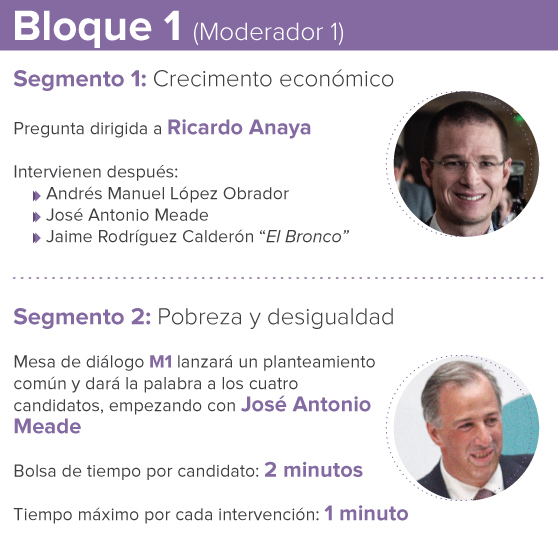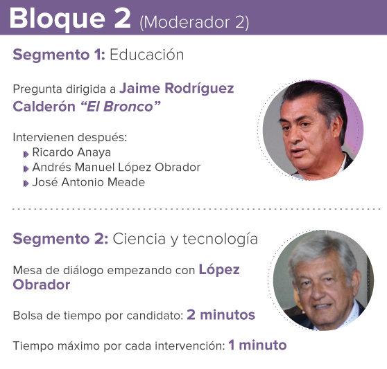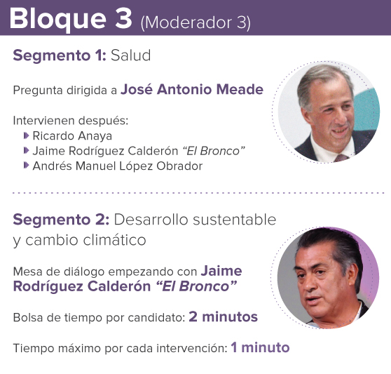Formato: Tres bloques con dos subtemas cada uno. Los candidatos debatirán en torno a 12 preguntas formuladas a partir de las interrogantes enviadas por redes sociales.Cada candidato tendrá una intervención final de un minuto en el siguiente orden: Andrés Manuel López Obrador; Jaime Rodríguez, José Antonio Meade y Ricardo Anaya.