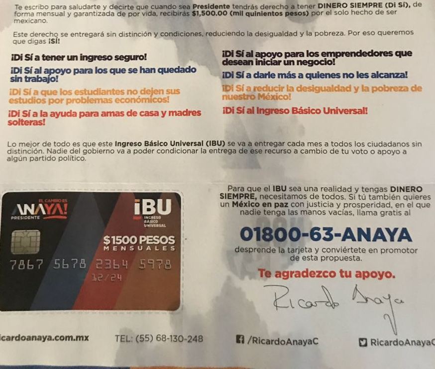 “Los partidos Acción Nacional y de la Revolución Democrática han estado repartiendo diversas tarjetas, denominadas IBU, mismas que son entregadas directamente en los domicilios de los ciudadanos. El ingreso básico universal será entregado cada mes a todos los ciudadanos sin distinción, esto es en caso de que gane Ricardo Anaya”, dijo.