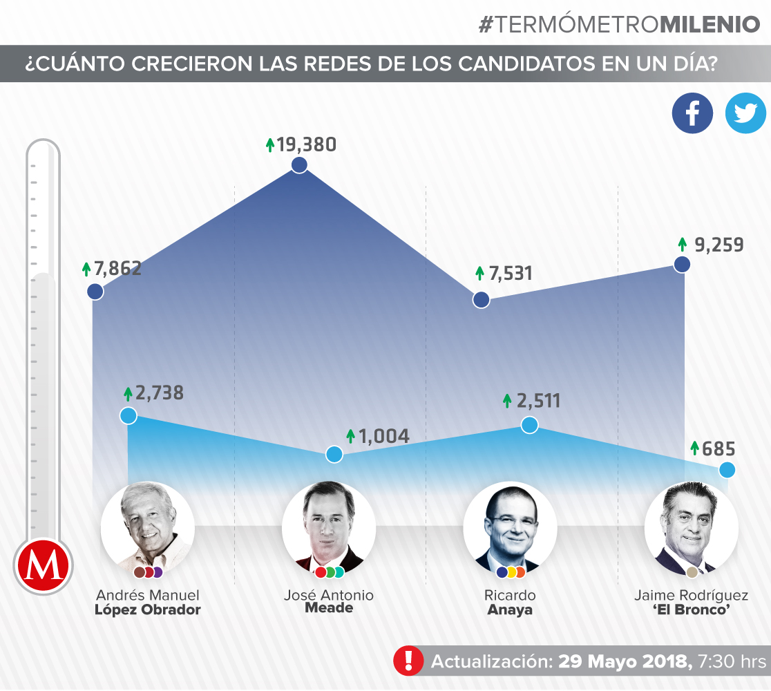 Quienes van parejos por el tercer lugar son Andrés Manuel López Obrador y Ricardo Anaya, quienes tienen 7 mil 800 y 7 mil 500 nuevos me gusta en Facebook, mientras que en Twitter pelean por el primer lugar de popularidad.