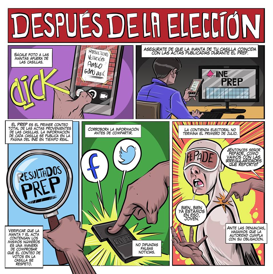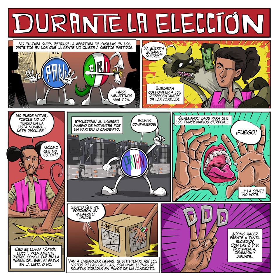 Durante la elección, recomienda tener cuidado, documentar, denunciar y difundir cualquier anomalía, pues dice que hay gente que busca retrasar la apertura de casillas para desincentivar el voto, sobornar a los funcionarios de casilla, "embarazar" urnas o impedir que votes al decir que no estás en la lista nominal.