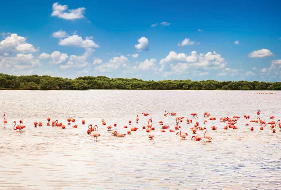 También por carretera llega a Celestún y renta una lancha para ir a observar flamencos, ya sea socializando y alimentándose en la ría o volando sobre la costa.