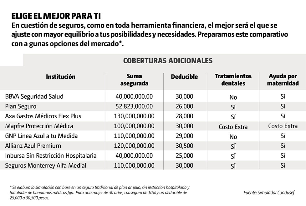 Las coberturas varían de acuerdo a la compañía y de lo establecido en elcontrato respecto de los términos en caso de accidentes, enfermedades crónicas o cirugías mayores; sin embargo, es posible contar con este tipo de atención desde 2,550 pesos anuales.